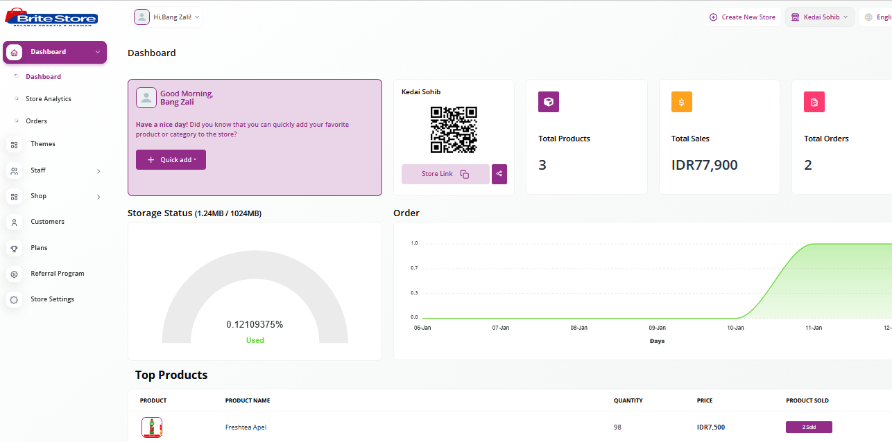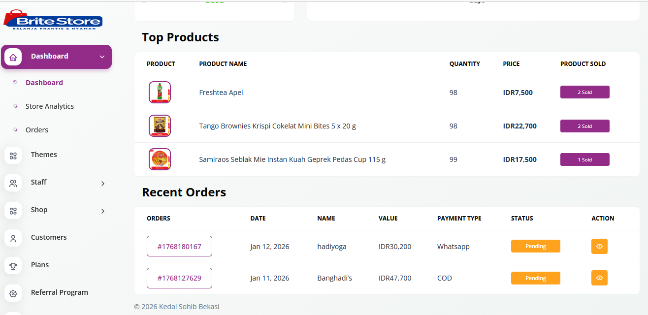 Dengan dashboard terpusat, sistem manajemen produk dan pesanan, serta analitik real-time, platform ini memungkinkan UMKM bertransaksi lebih rapi, meningkatkan konversi, dan mendorong pertumbuhan bisnis yang berkelanjutan.